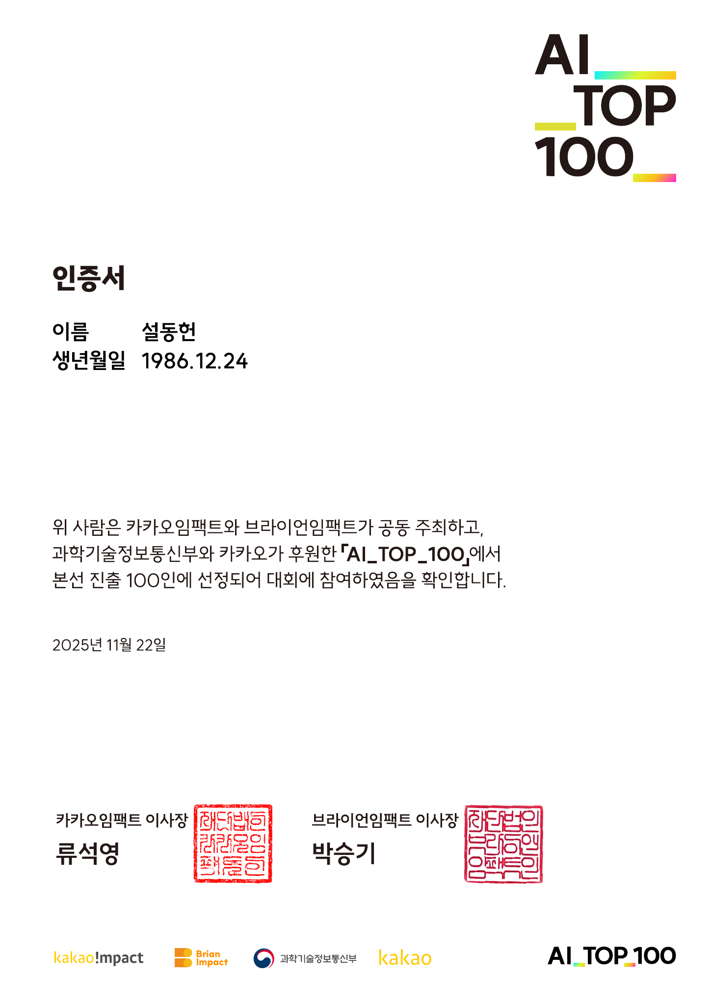 🥇 AI_TOP_100 특별상 - 카카오/브라이언임팩트 (2025)